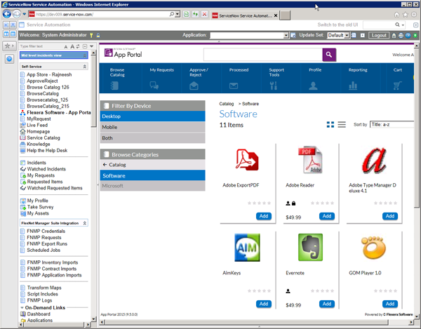 - In the Self-Service menu, click Flexera Software App Portal . App Portal will open in the right pane of the ServiceNow interface.