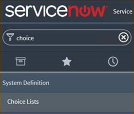 4. Login to ServiceNow and search for "choice" in the navigation panel, and then select System Definition > Choice Lists .