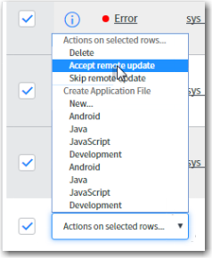 - To resolve an error, select it, open the Actions on selected rows... menu at the bottom of the screen, and click Accept remote update .