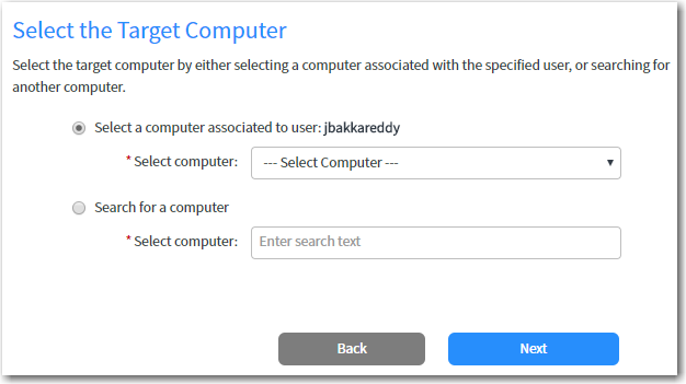 - To select one of the computers associated with the specified user to update, select the Select a computer associated to use: USERNAME , and select a computer name from the Select computer list.