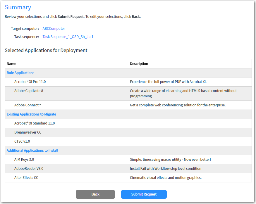- From the Task sequence list, select the task sequence corresponding to the action you want to take, and then click Next . The Role Applications panel opens, listing the applications that are associated with the selected employee’s roles, which will be installed on the target computer.