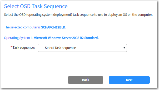 - After you select a computer to update, click Next . The Select OSD Task Sequence or Select Non-OSD Task Sequence panel opens, listing the name of the selected computer and its current operating system.